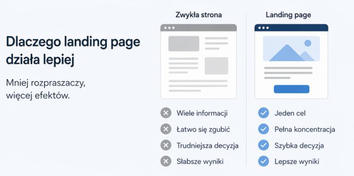 Wyobraź sobie, że ktoś klika reklamę na Facebooku. Zamiast trafiać na dużą stronę firmową, trafia na jedną, prostą stronę z konkretną ofertą. Dzięki temu łatwiej podejmuje decyzję.